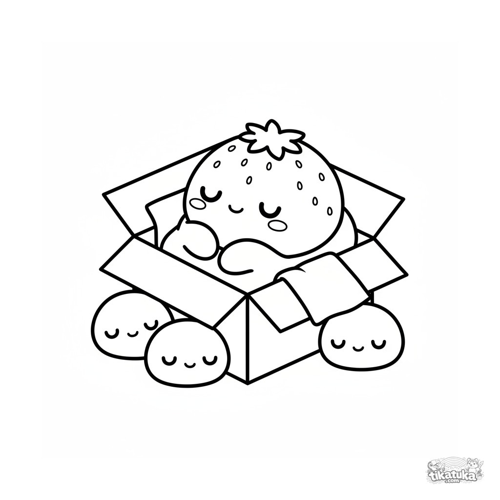 Página simple para colorear para niños pequeños: un mochi de fresa soñoliento duerme en una caja de snacks, cubierto con una servilleta. Formas muy simples.