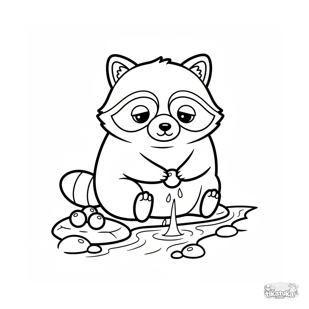 Página para colorear simple para niños pequeños de 2-3 años: un mapache de peluche somnoliento lava una baya en un arroyo. Formas grandes y claras.