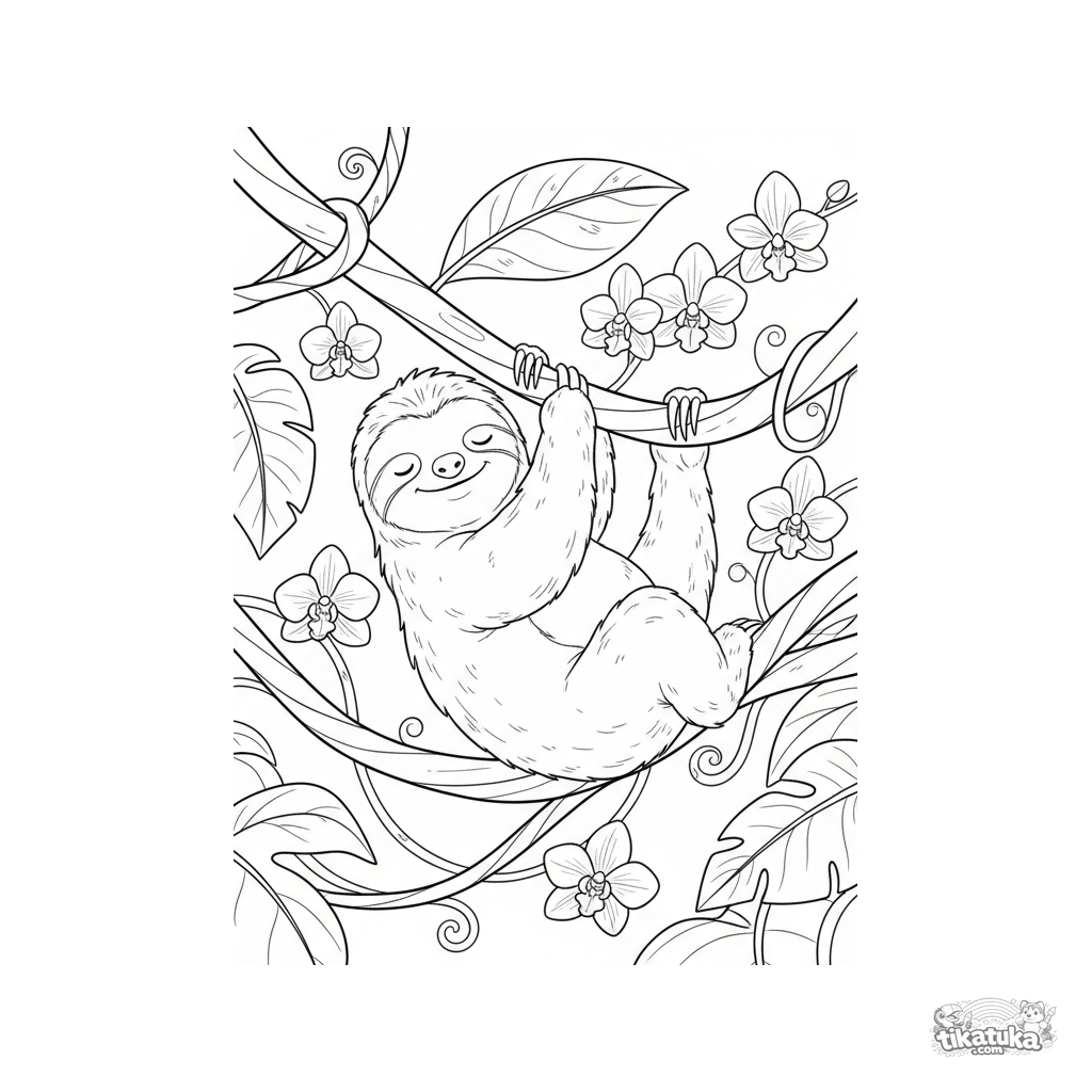 Página para colorear para niños: un perezoso dormilón cuelga de una liana en una selva nebulosa, con orquídeas. Detalle medio para edades 4-6.