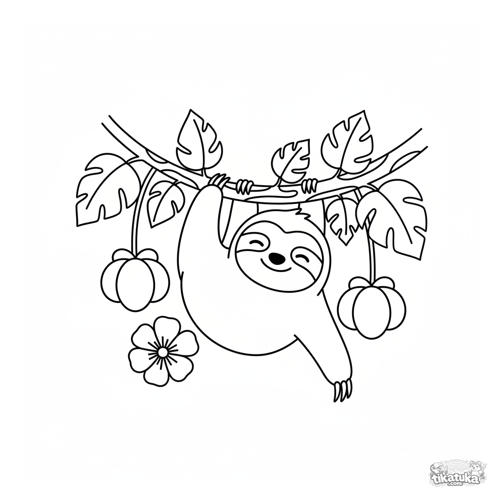 Página simple para colorear para niños pequeños 2-3 años con un lindo perezoso somnoliento colgando de un puente de lianas. Formas grandes y claras.