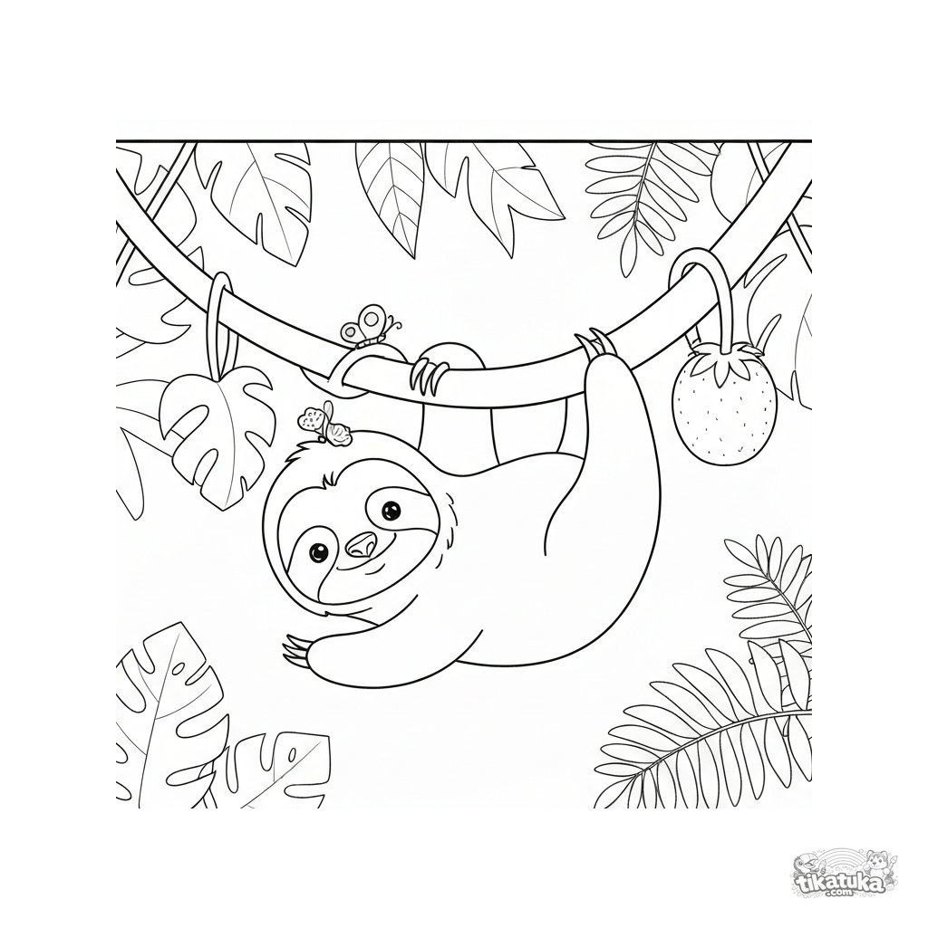 Página para colorear de un perezoso somnoliento en la selva para niños de 5 a 8 años. Cuelga de una enredadera, alcanza una fruta, con una mariposa en la cabeza.