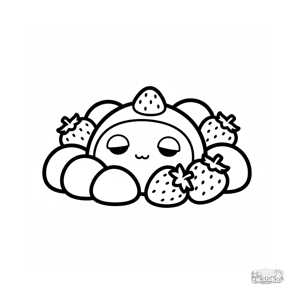 Página simple para colorear para niños de 2-3 años. Un mochi de fresa dormilón en un montón de bayas. Formas grandes, pocos detalles.