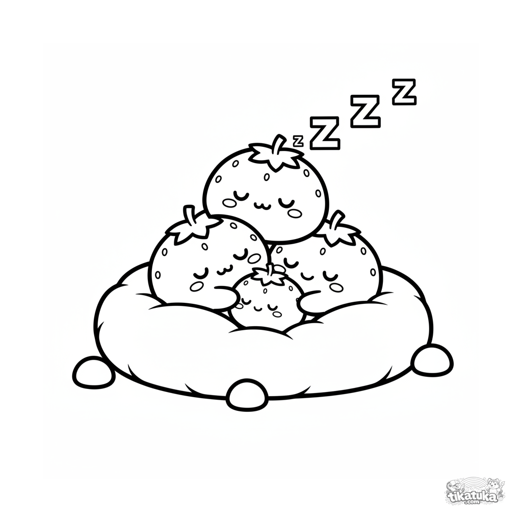 Página para colorear simple para bebés 2-3 años: un montón de mochi de fresa durmiendo en un cojín. Formas grandes.