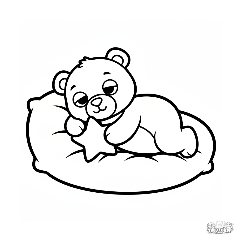 Página para colorear para niños pequeños de 2-3 años: un osito de peluche dormilón descansa en una almohada suave. Formas grandes y simples con amplios márgenes.