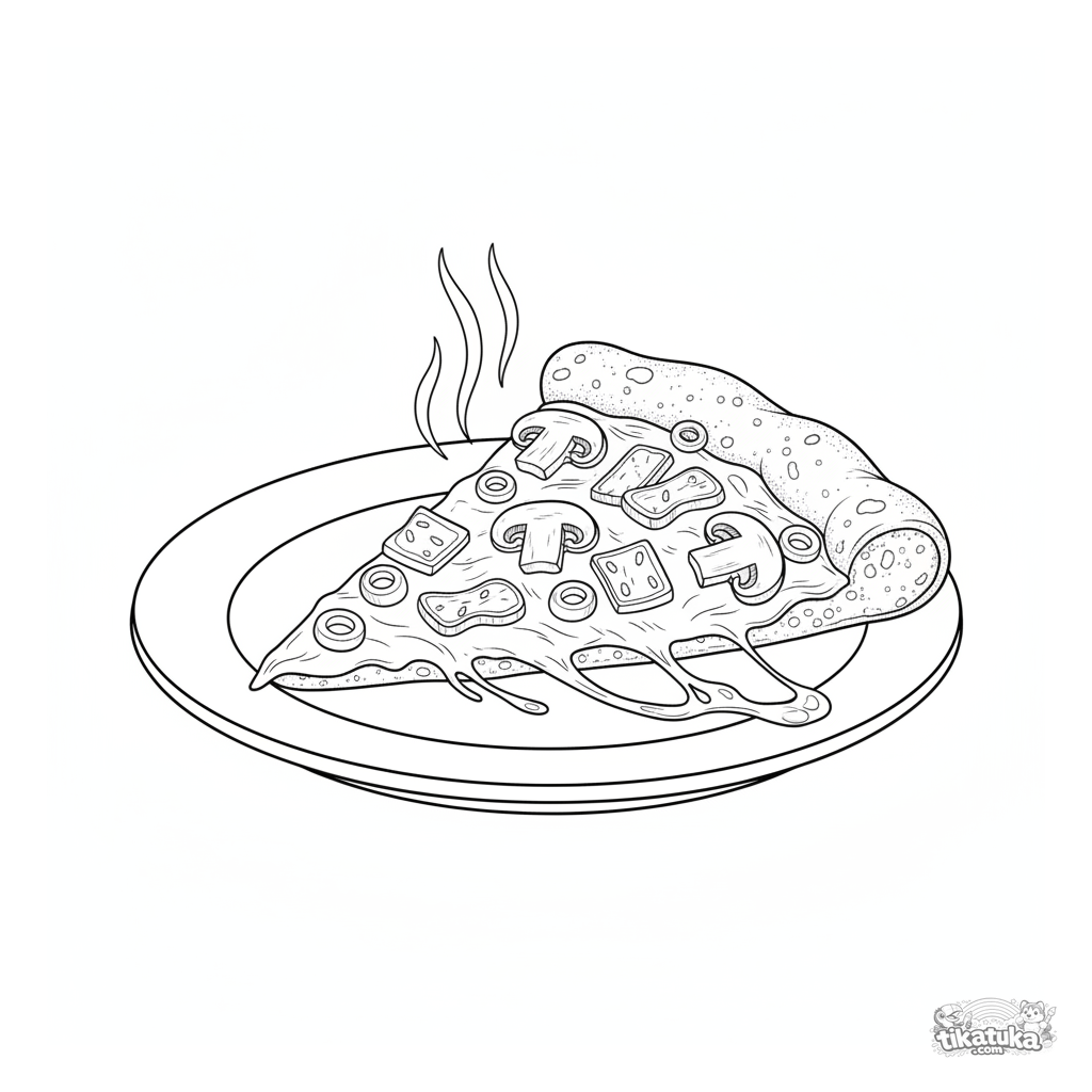 Página para colorear para niños mayores 7-12: una porción detallada de pizza con varios ingredientes en un plato. Alta dificultad, estilo realista, desarrolla concentración.