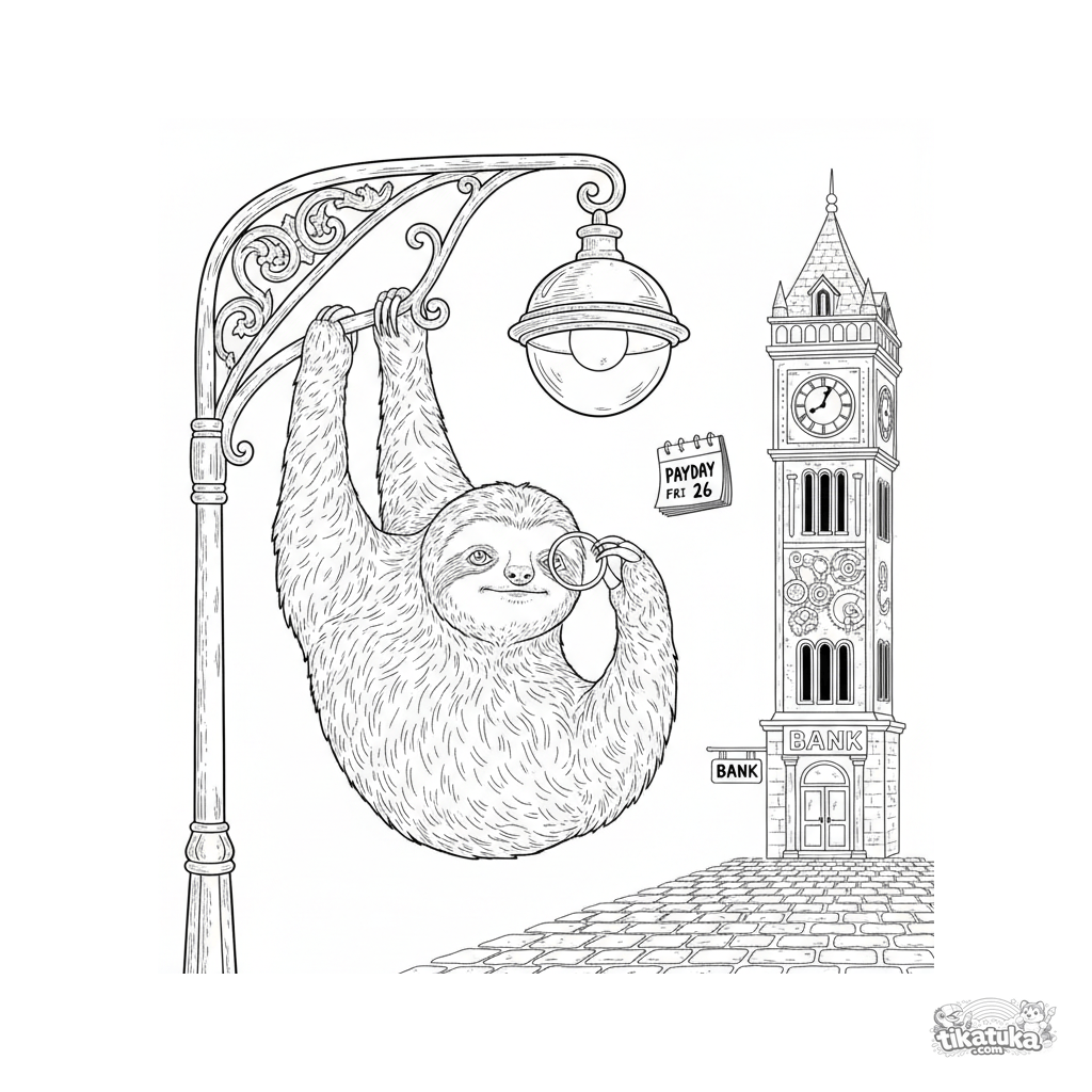 Página para colorear para niños 10-12: un perezoso colgado de una farola mirando por un monóculo la torre de un banco, esperando el día de pago. Escena detallada en estilo vintage.