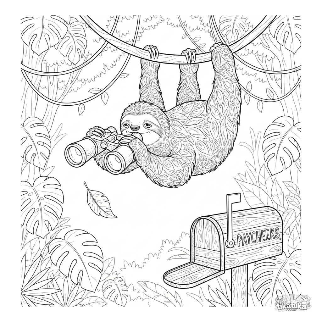 Página para colorear para niños 10-12: un perezoso colgado de una liana usa prismáticos para observar un buzón de pago. Escena graciosa y detallada en estilo acuarela.