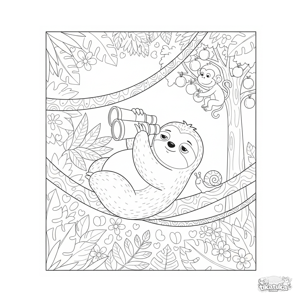Página para colorear para niños 10-12: un perezoso relajado colgado boca abajo de una enredadera, mirando lentamente a través de binoculares al revés a un mono ocupado. Escena de jungla graciosa y detallada.