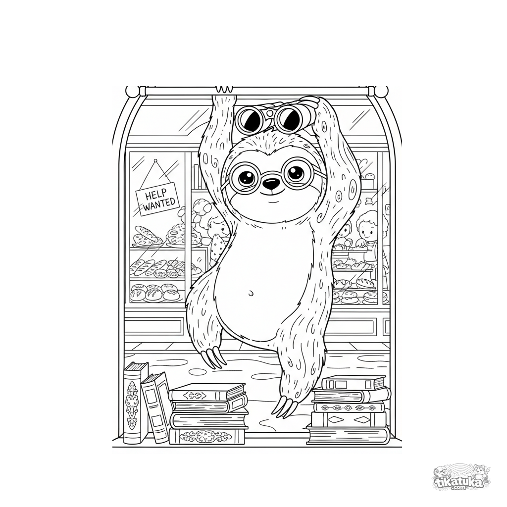 Página para colorear para niños de 10-12 años: un perezoso con gafas cuelga de una barra de cortinas de biblioteca, usando lentamente prismáticos para mirar una panadería al otro lado de la calle. Escena graciosa y detallada.