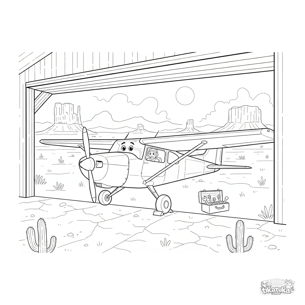 Página para colorear de una avioneta aparcada en un hangar con paisaje desértico al fondo. Para preadolescentes de 7-9 años.