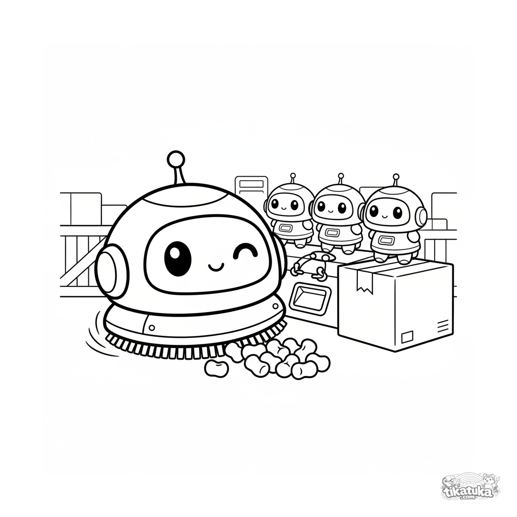 Página para colorear para preadolescentes 7-9: un robot conserje pequeño y redondo con un cepillo barre escombros cerca de una estación de carga de drones.