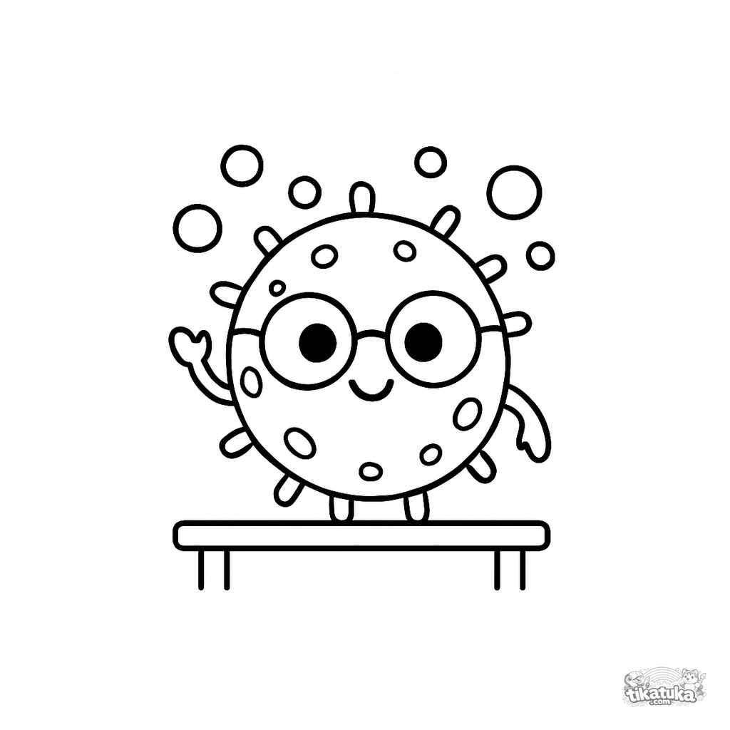 Página para colorear para niños. Bacteria de dibujos animados amigable con gafas de científico saludando en mesa de laboratorio con burbujas. Descarga gratis.