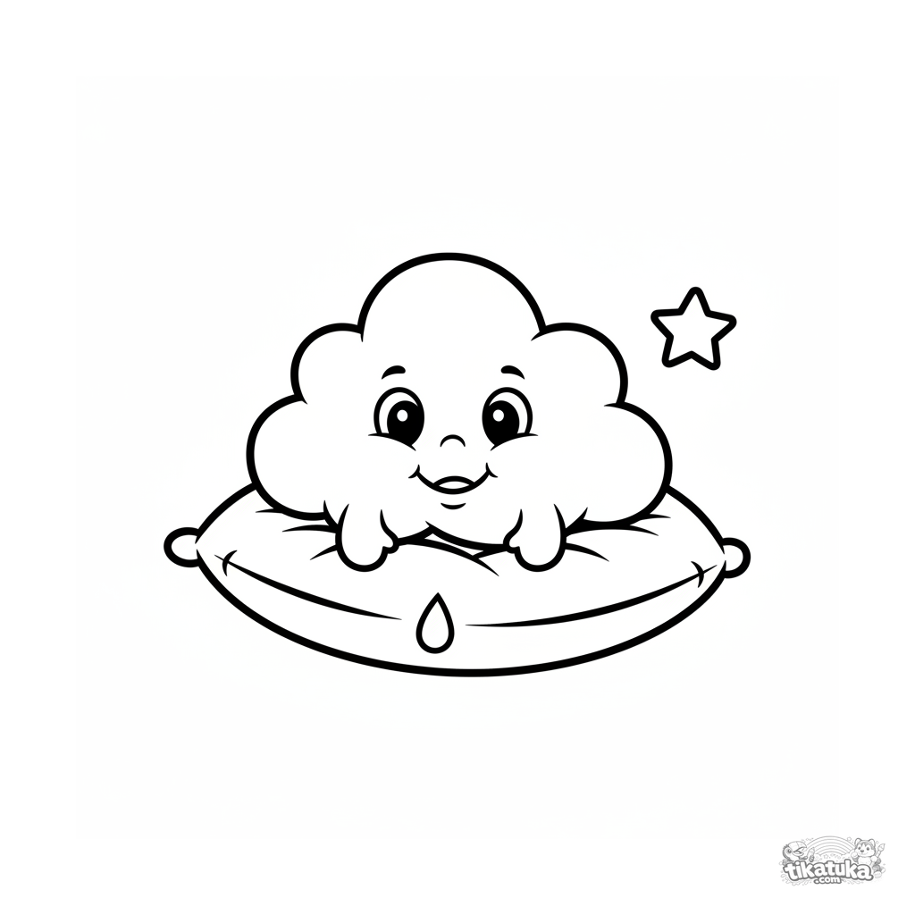Página para colorear para niños pequeños: una nube esponjosa sonriente descansando en un cojín suave. Formas muy simples, áreas grandes para colorear y márgenes amplios.