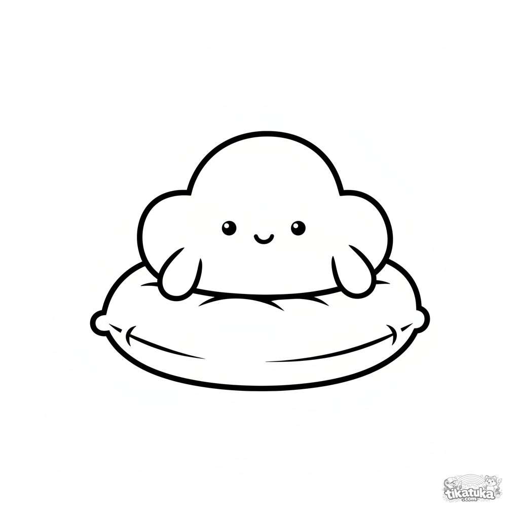 Página para colorear para niños pequeños: una nube sonriente descansa en una almohada. Contornos muy simples, áreas grandes para colorear.