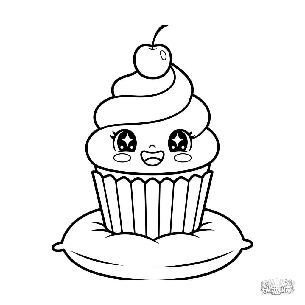 Página para colorear divertida para niños pequeños: una magdalena sonriente con una cereza se sienta en un cojín. Formas grandes y simples, imagen reconocible.