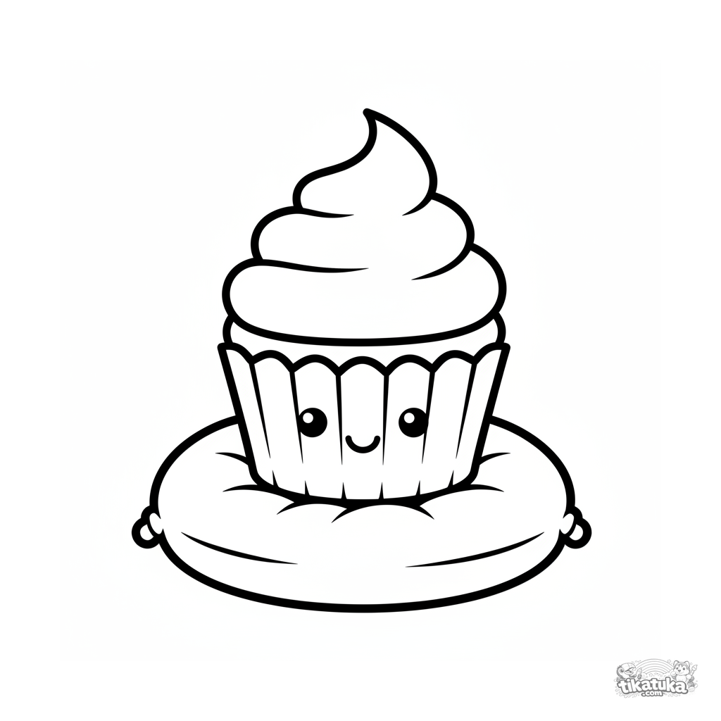 Página linda para colorear para niños pequeños: un cupcake sonriente sentado en un cojín. Estilo kawaii, formas simples y grandes, casi sin detalles.