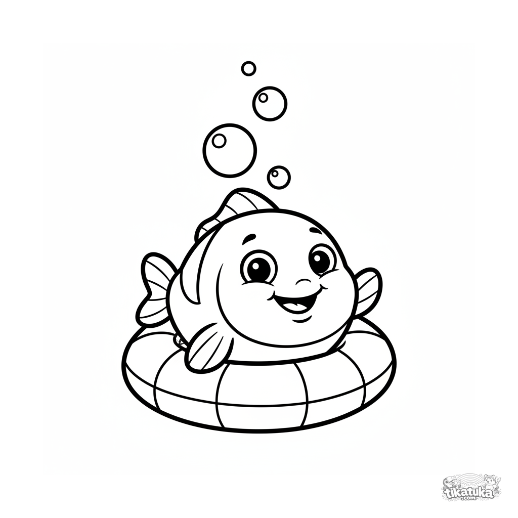 Página muy simple para colorear para niños de 2-3 años: un pez sonriente se asoma desde un aro inflable en una piscina.