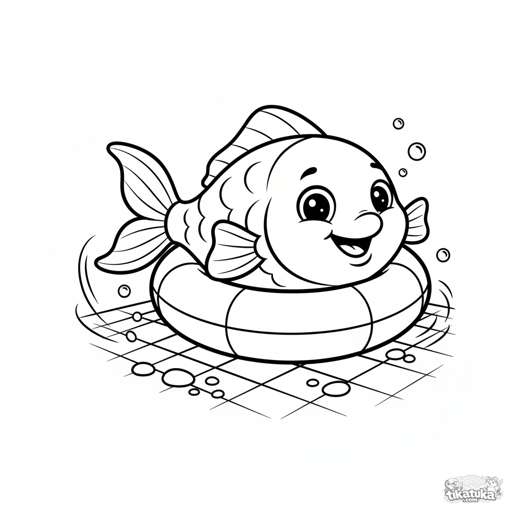 Página para colorear para niños de 4-6 años: un pez sonriente juega alegremente al cucú asomándose por el agujero de un aro inflable.