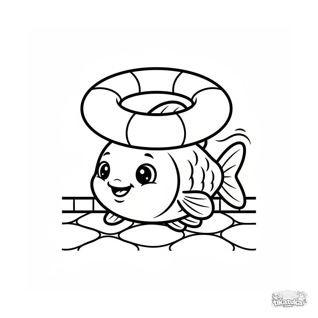 Página para colorear muy simple para niños pequeños de 2-3 años: un pez grande y sonriente nada bajo un flotador en el fondo. Formas grandes, contornos gruesos, pocos detalles.