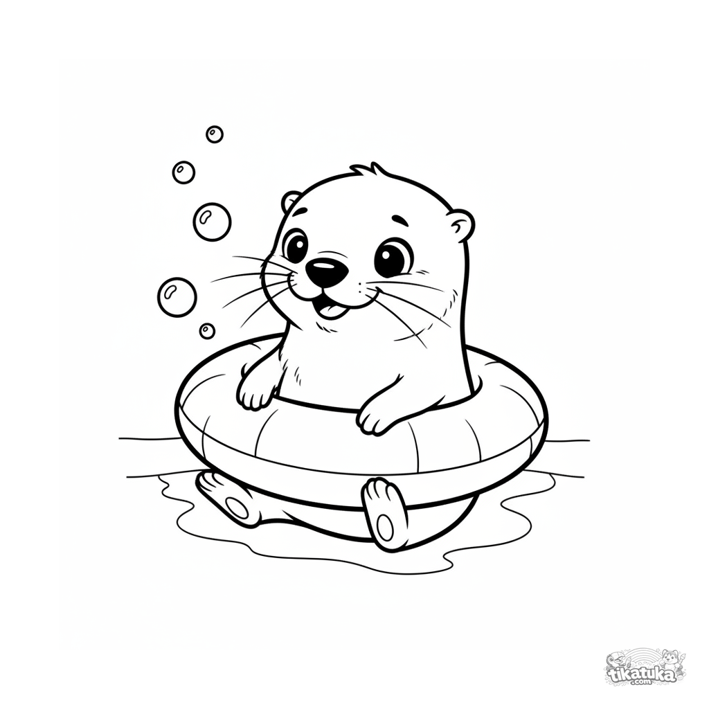 Página para colorear para niños 4-6 años: una alegre cría de nutria hace rodar un flotador por el fondo de la piscina. Cara expresiva, fondo simple, estilo amigable.