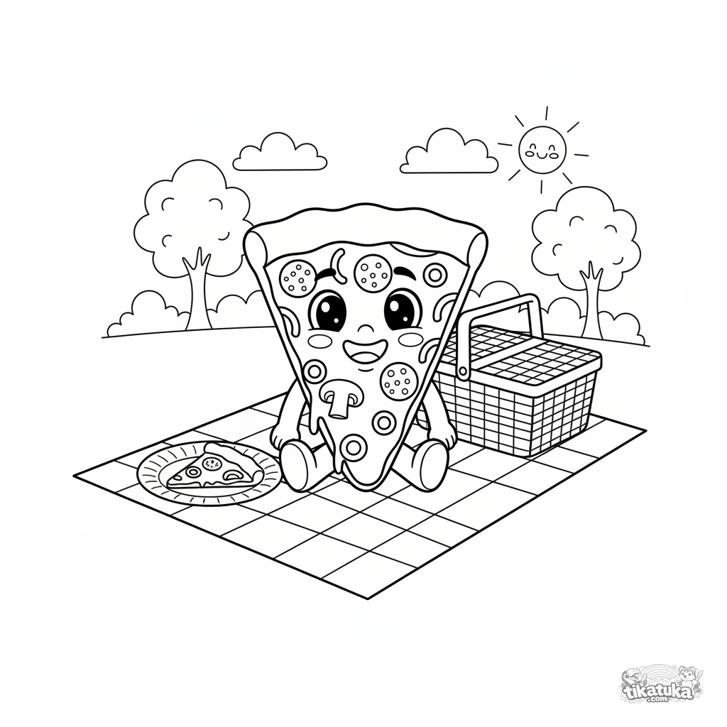 Página para colorear de una rebanada de pizza sonriente en un picnic. Para niños de 4 a 6 años.
