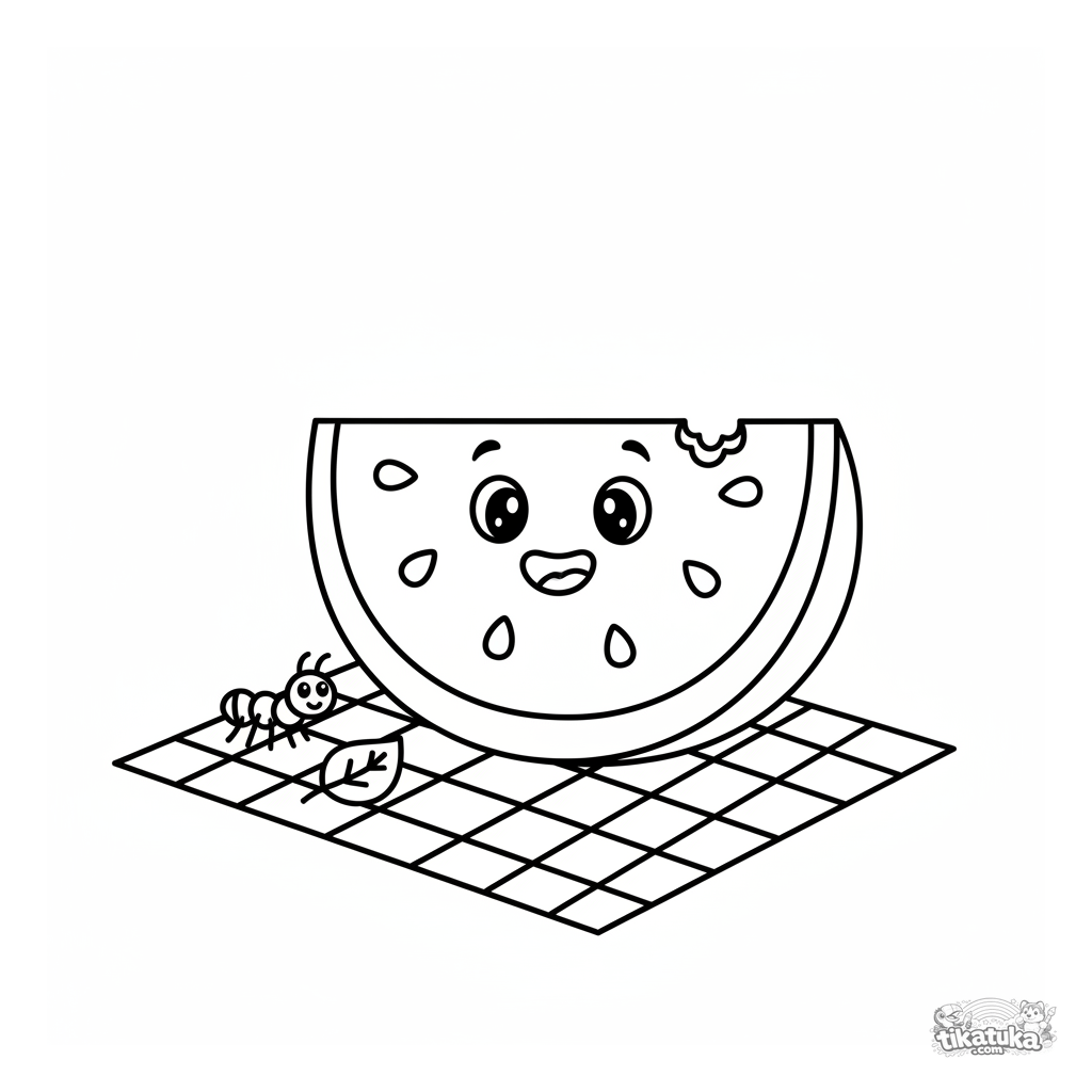 Página simple para colorear para niños pequeños: un trozo de sandía sonriente en una manta. Para 2-3 años. Formas grandes y simples con semillas.