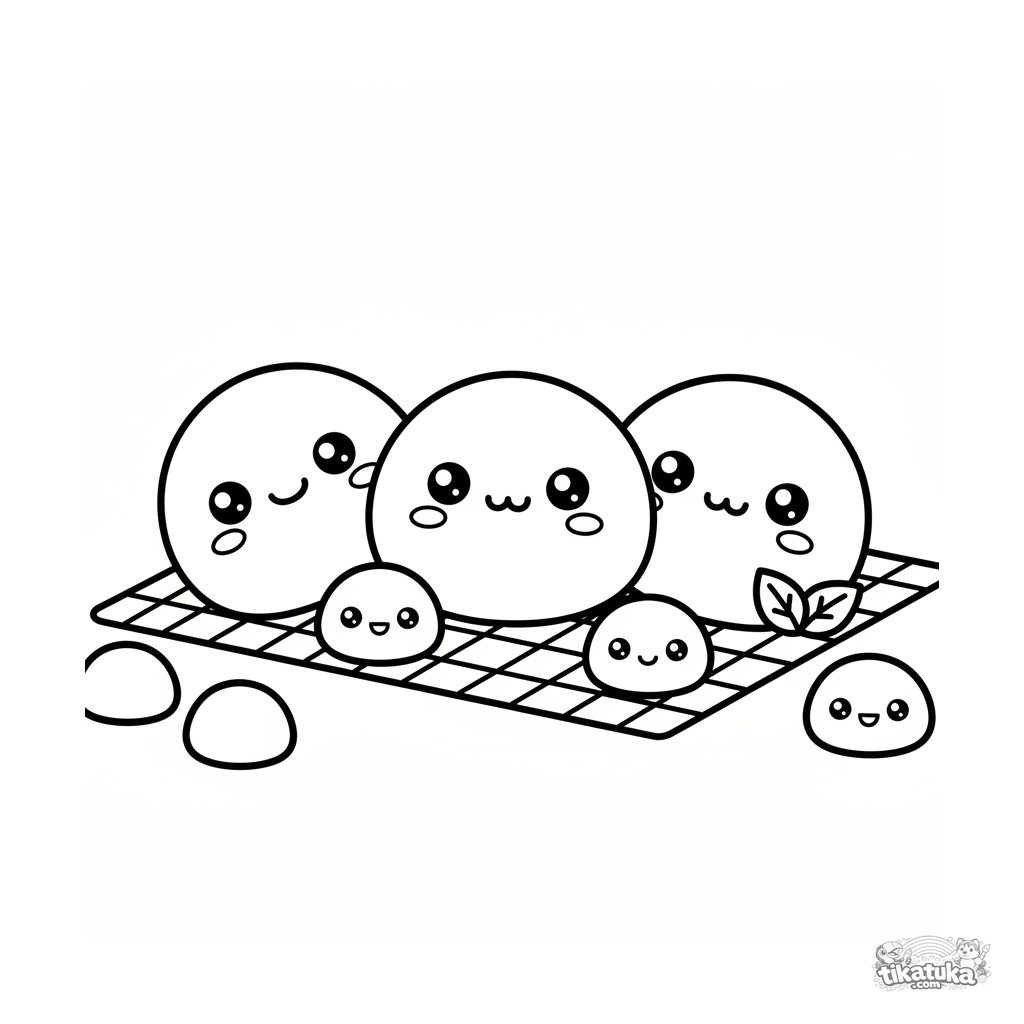 Página para colorear para niños pequeños: tres mochi de fresa sonrientes en una estera de bambú. Formas simples y caras lindas son perfectas para los artistas más jóvenes.