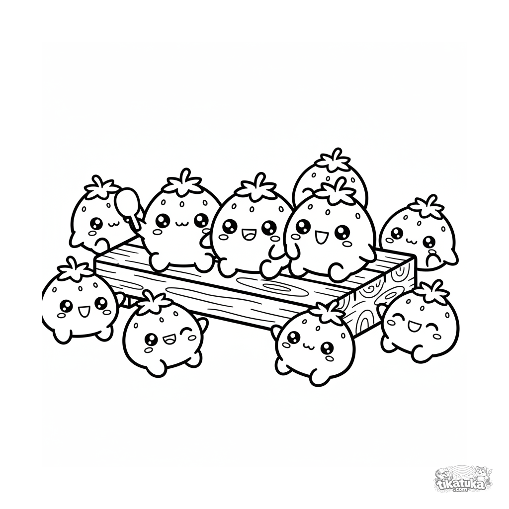 Página para colorear con tres mochi de fresa sonrientes en una tabla. Formas simples para niños de 2-3 años. Imprimible gratis.