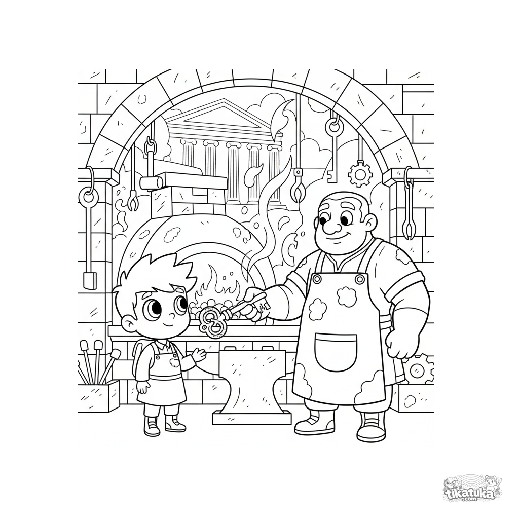 Página para colorear para niños de 6-11 años: un dios herrero amable ayuda a un viajero en su forja junto a un palacio de mármol. Muchos detalles de herramientas.