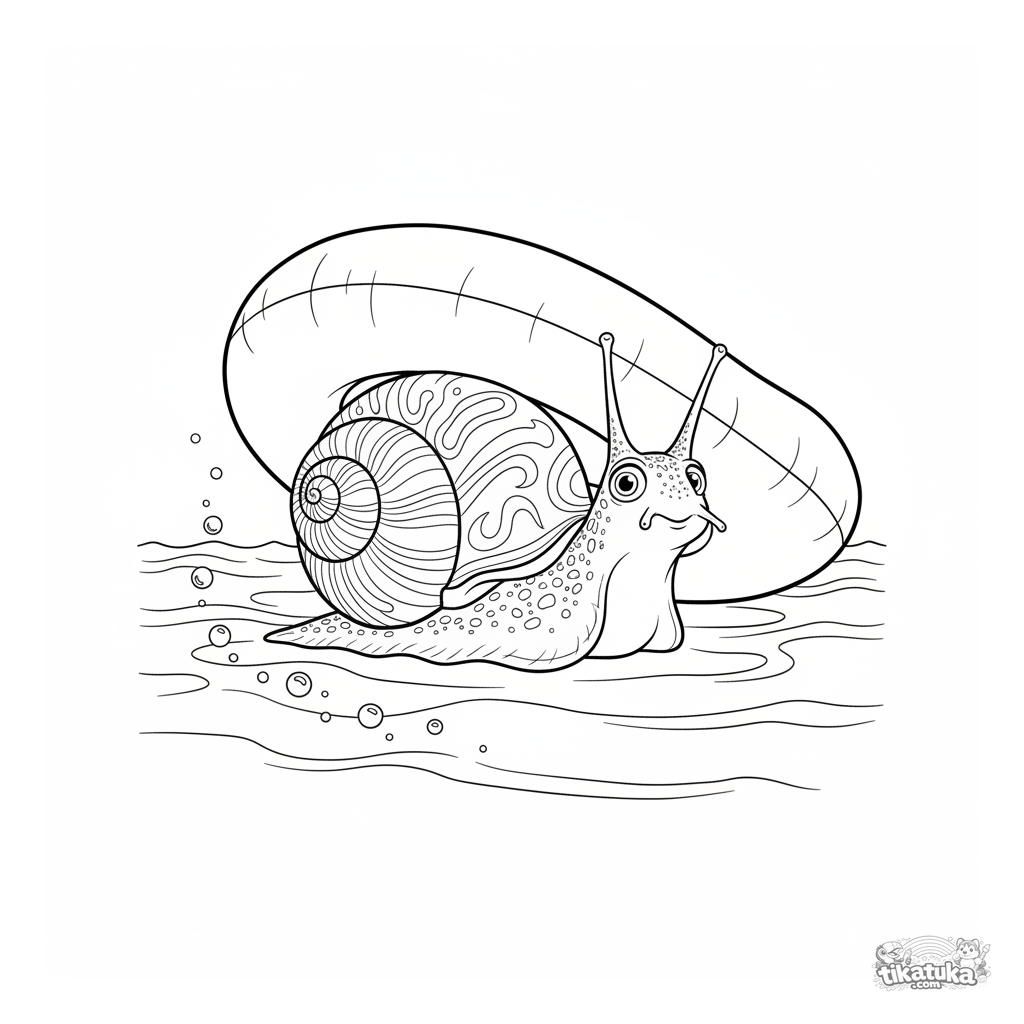 Página detallada para colorear para niños 10-12: un caracol con concha espiral asoma cautelosamente desde bajo el borde de un aro inflable en el fondo de la piscina.