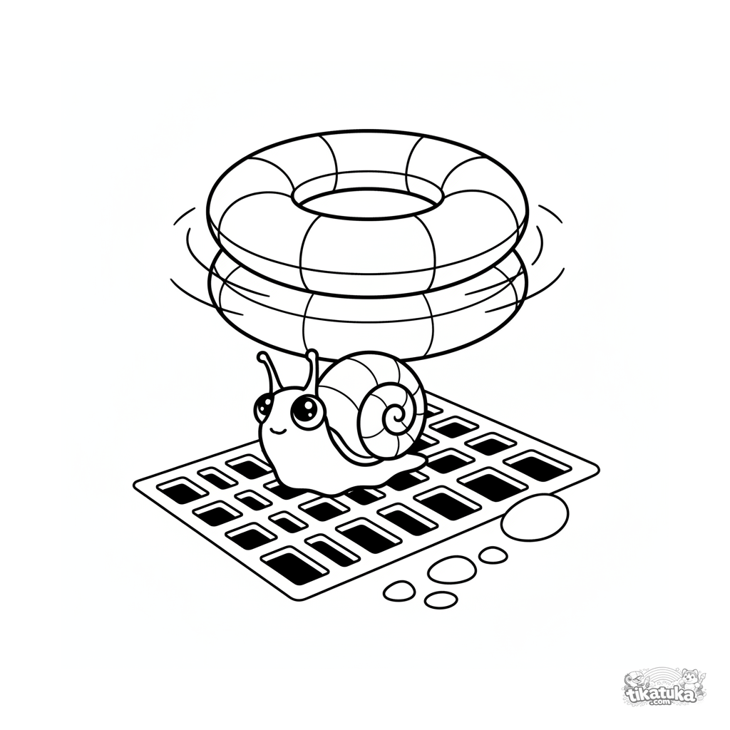 Página para colorear para 7-9 años: un pequeño caracol se arrastra por la rejilla del desagüe de la piscina, con un flotador flotando arriba. Contornos nítidos, estilo geométrico de papel cortado.