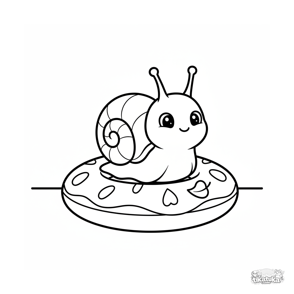 Página muy simple para colorear para niños pequeños de 2-3 años: un caracol sonriente se sienta en un aro inflable en el fondo de la piscina. Formas grandes y claras.