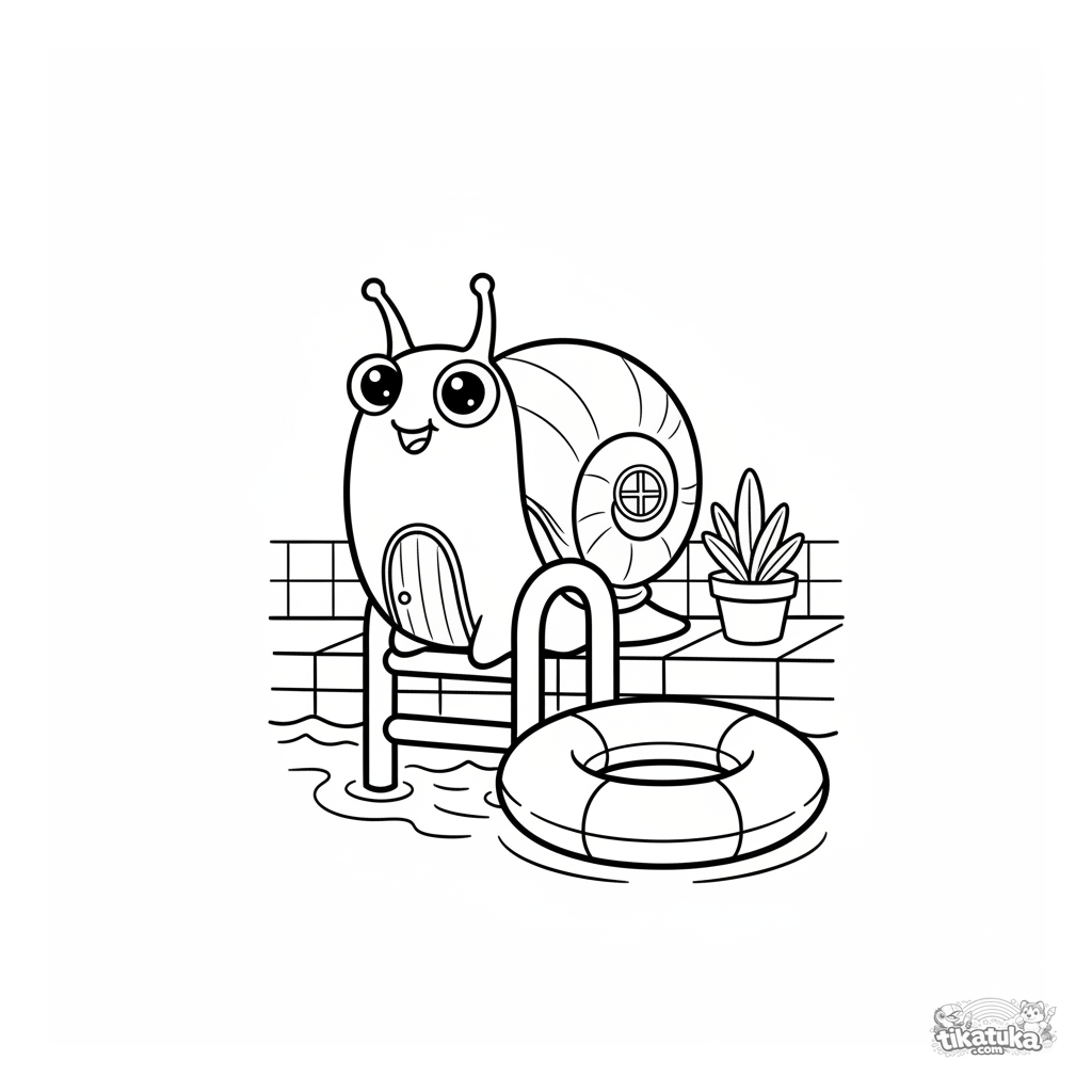 Página para colorear de un lindo caracol cuya concha parece una casita, subiendo una escalera de piscina. Para niños de 4 a 6 años.