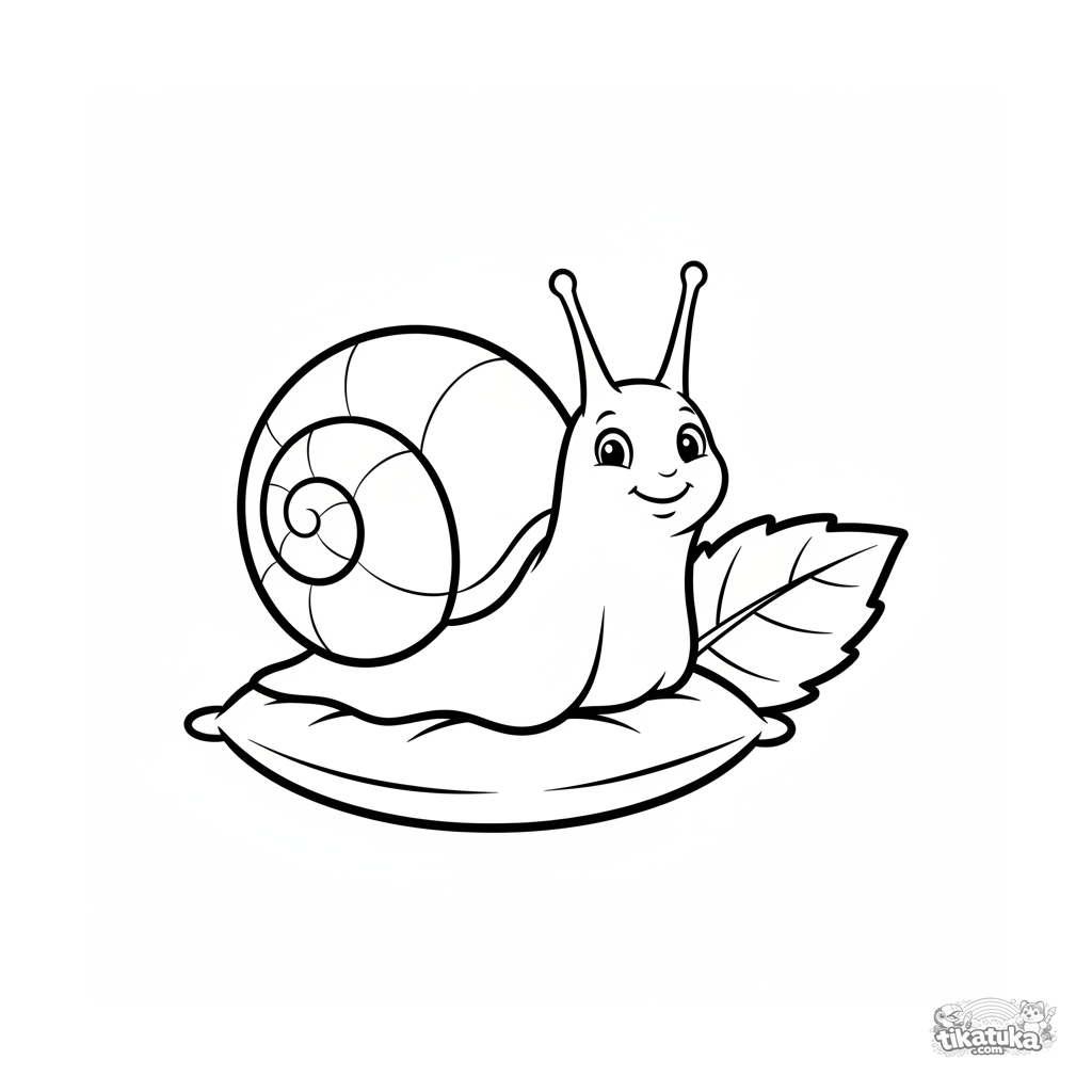 Página para colorear para 2-3 años: un caracol con casa-concha descansa en un cojín suave. Contornos claros, formas grandes.