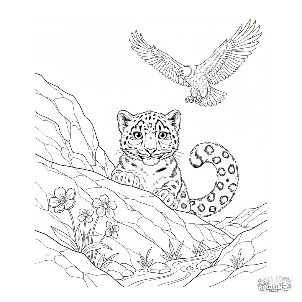 Página para colorear de un cachorro de leopardo de las nieves en un saliente rocoso. Para niños de 6 a 9 años. Un cachorro curioso, flores alpinas y un arroyo.