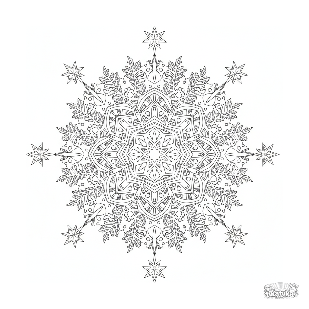 Página para colorear de mandala copo de nieve intrincada para 10-12 años. Simetría de seis puntas, cristales de hielo, patrones de escarcha—diseño geométrico detallado con tema invernal ideal para colorear concentrado.