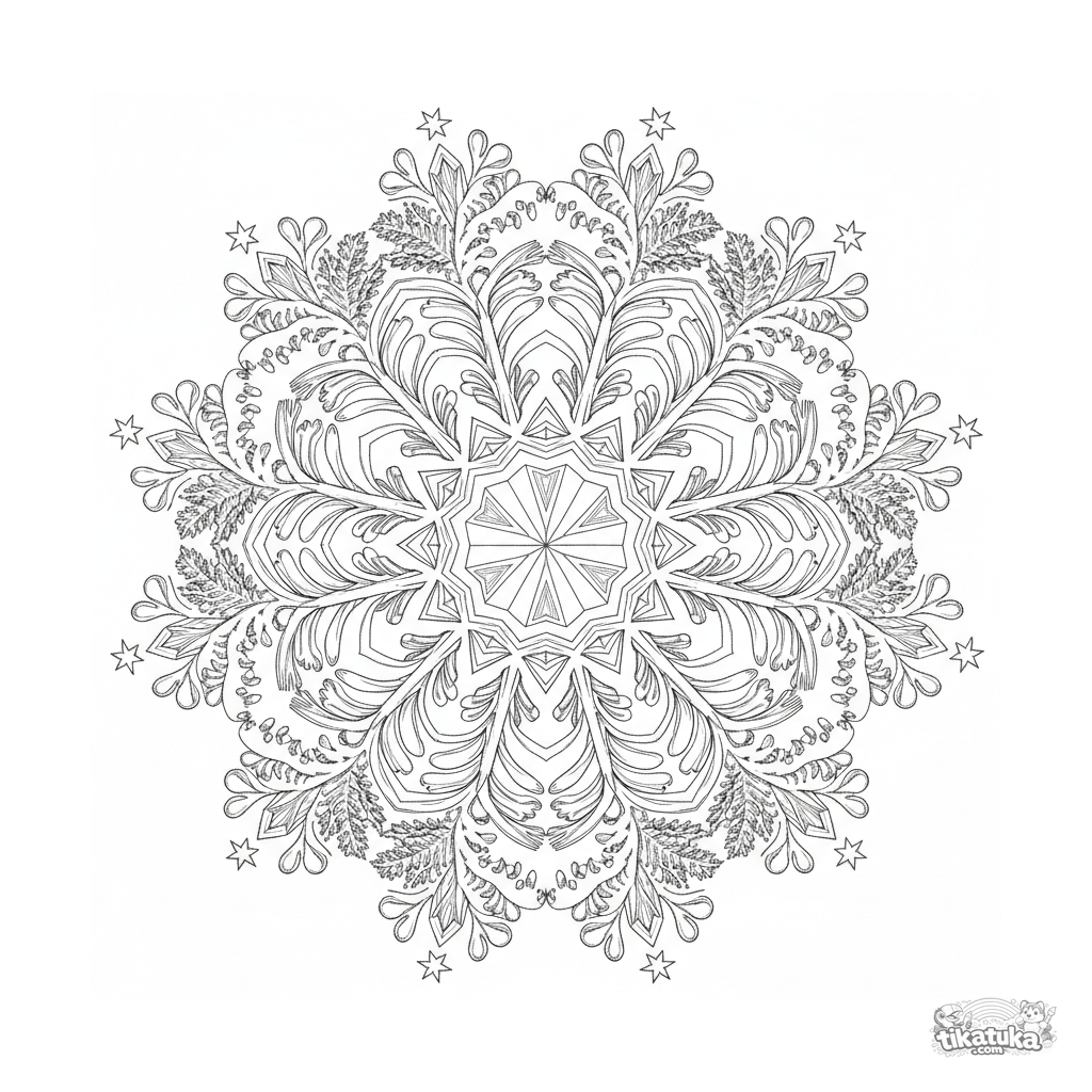 Página para colorear de mandala de copo de nieve detallada para 10-12 años. Centro de cristal de hielo hexagonal, intrincados patrones de escarcha ramificados, estrellitas en las puntas. Diseño simétrico de inspiración científica para colorear meticuloso.