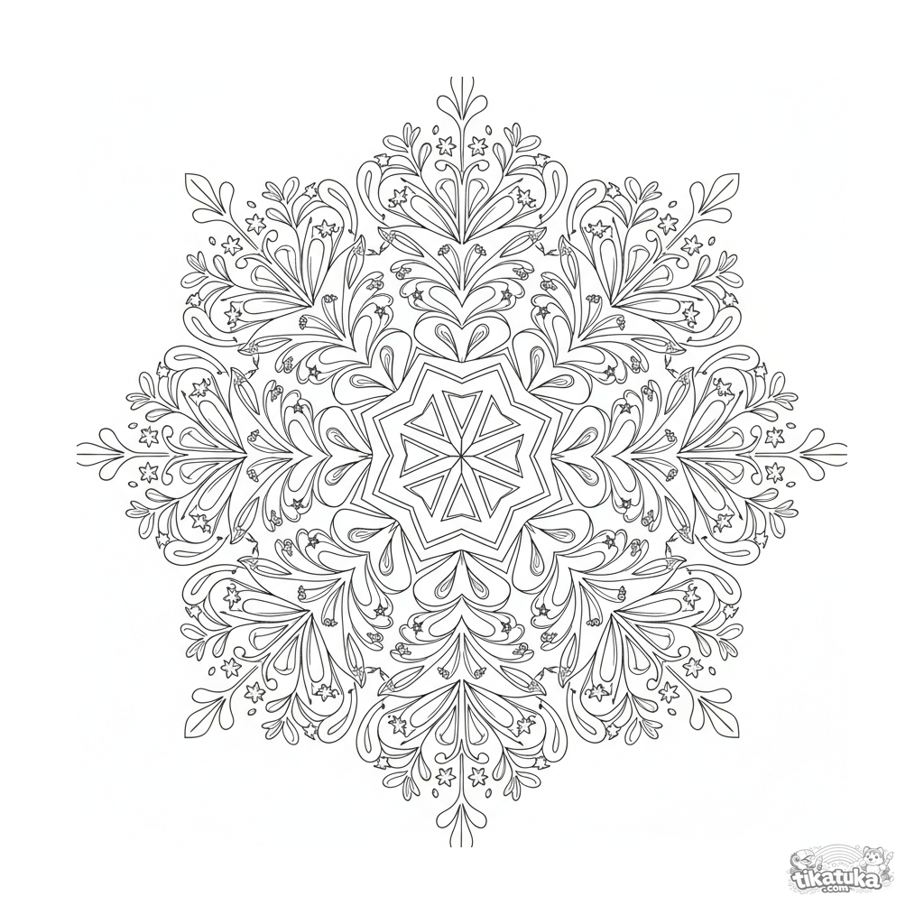 Página para colorear de mandala copo de nieve detallada para 10-12 años. Cristal de hielo hexagonal central con ramas plumosas y detalles estrellados en simetría de seis partes.