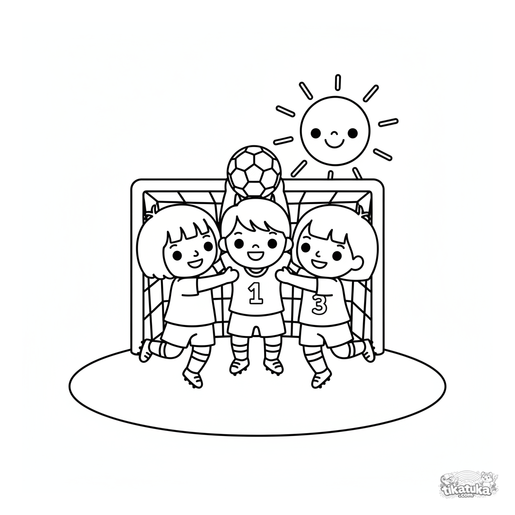 Página para colorear para niños pequeños 2-3: un feliz equipo de fútbol de niños saltando de alegría tras marcar un gol. Escena simple con formas grandes y claras.