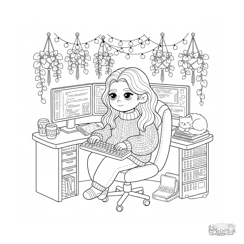 Página para colorear para 10-12 años: un programador trabajando en un sótano acogedor lleno de plantas con luces de hadas. Detalles: múltiples monitores, torre de servidores, gato durmiendo.