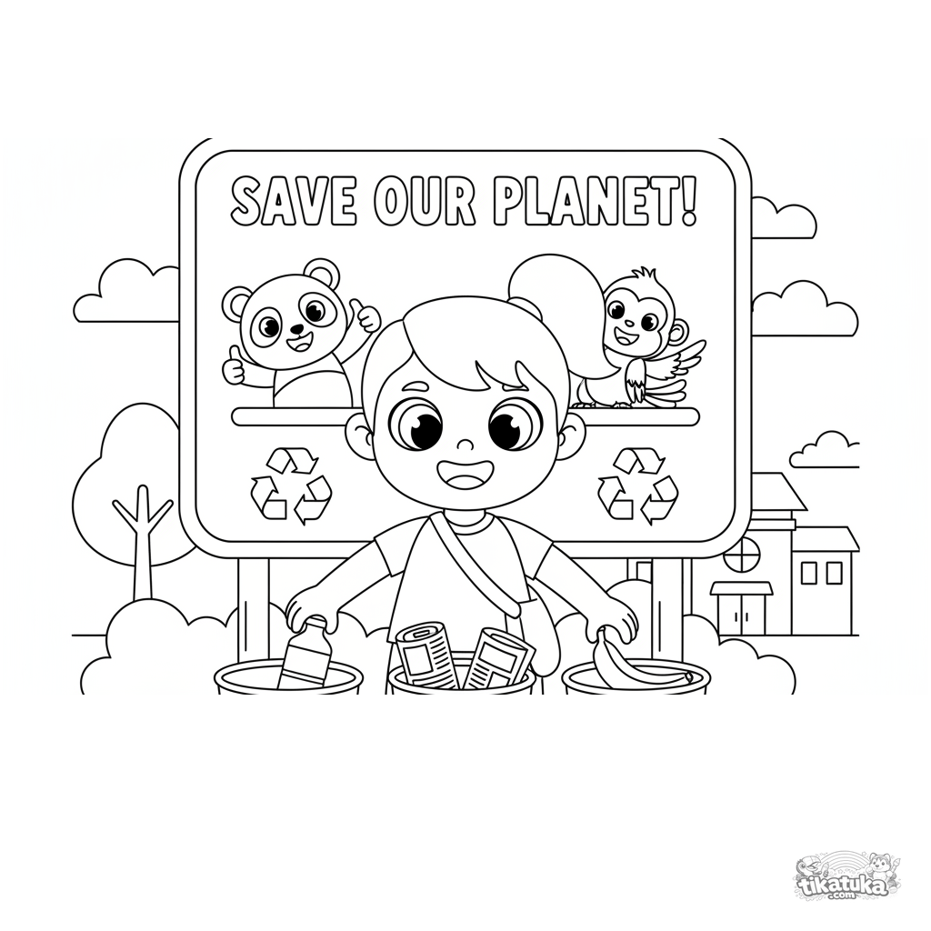 Página para colorear para niños 7-9: un niño clasifica basura en diferentes contenedores en un cartel educativo de ecología del zoológico. Aprender a cuidar la naturaleza.