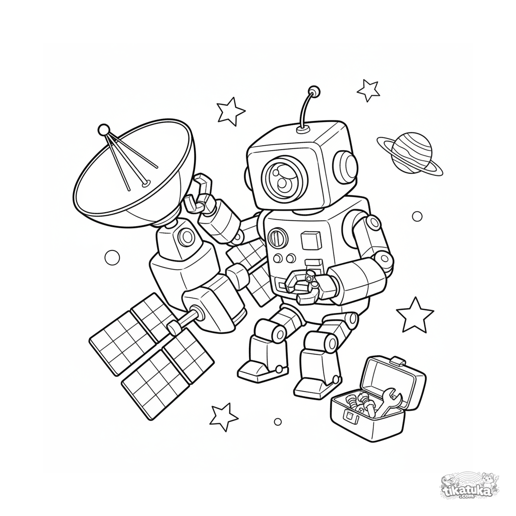 Página para colorear para niños 7-9: un robot ingeniero de bloques repara una antena satelital flotando en el espacio exterior entre estrellas. Escena activa.