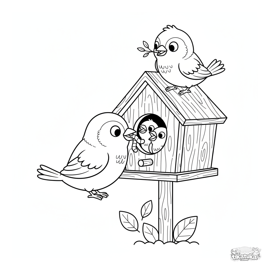 Página para colorear para niños 4-6: una familia de gorriones en una acogedora casa de pájaros de madera. La madre alimenta a los polluelos mientras el padre vigila en el techo.