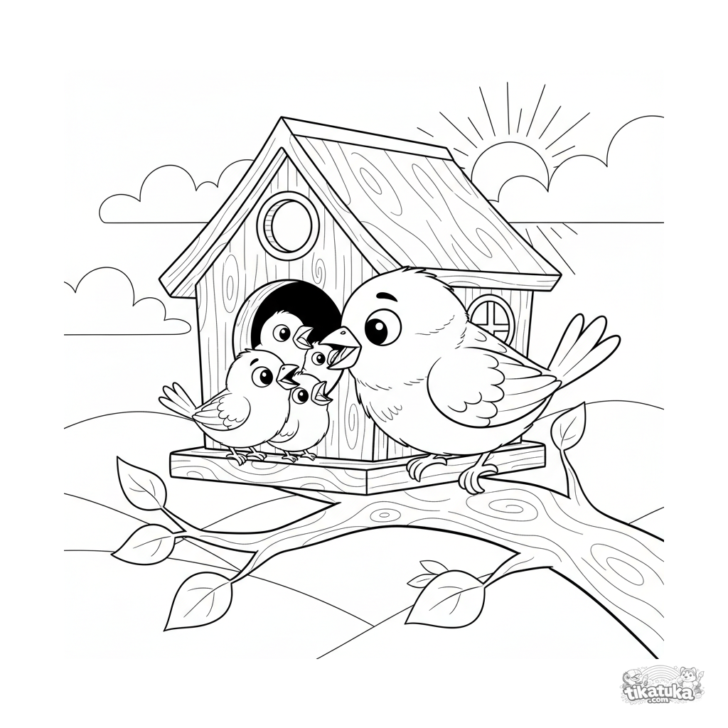 Página para colorear para niños 4-6: una familia de gorriones en una casa de pájaros de madera. Un pájaro adulto alimenta a tres polluelos hambrientos.