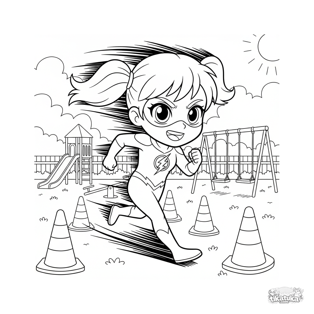 Página para colorear para niños 4-6: un superhéroe de velocidad entrena en un circuito de obstáculos en el patio escolar, dejando una estela de desenfoque.