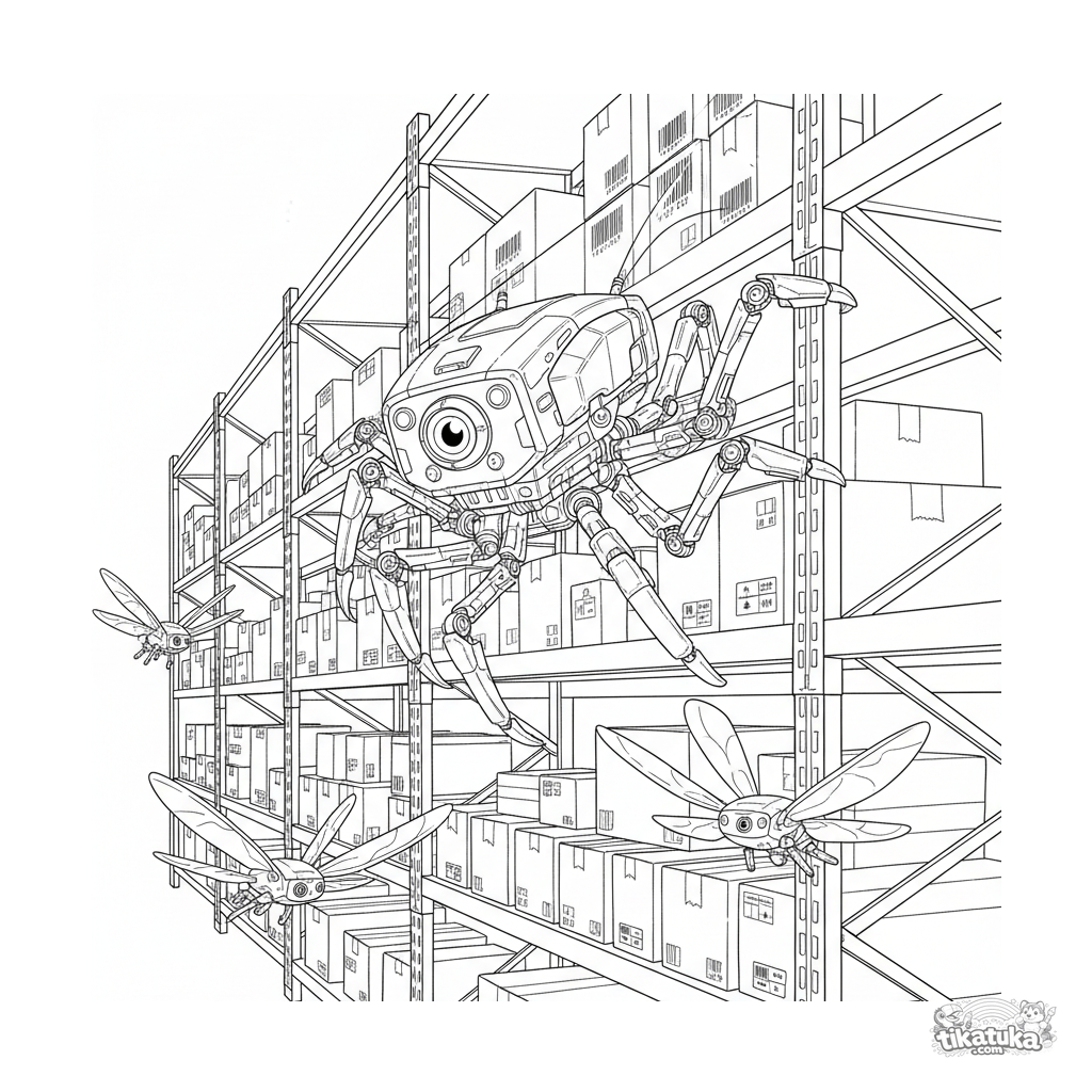 Página para colorear técnica compleja para niños mayores de 10-12 años: un robot araña de múltiples patas trepa por los estantes del techo del almacén y escanea códigos de barras en cajas, con drones volando abajo en los pasillos.
