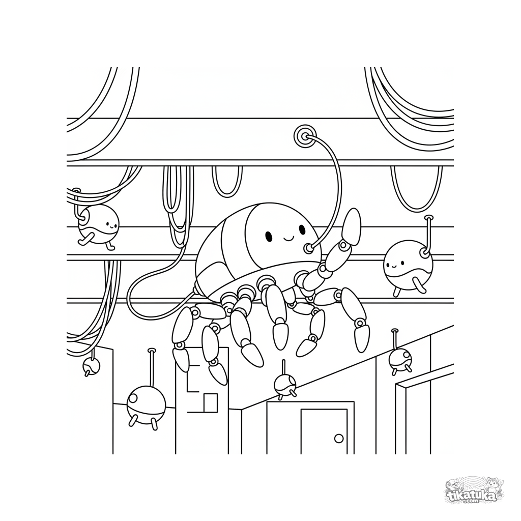 Página para colorear para niños de 4-6 años: un robot con forma de araña con muchas patas instala un sensor en una viga. Pose dinámica, estilo cómic de aventuras.