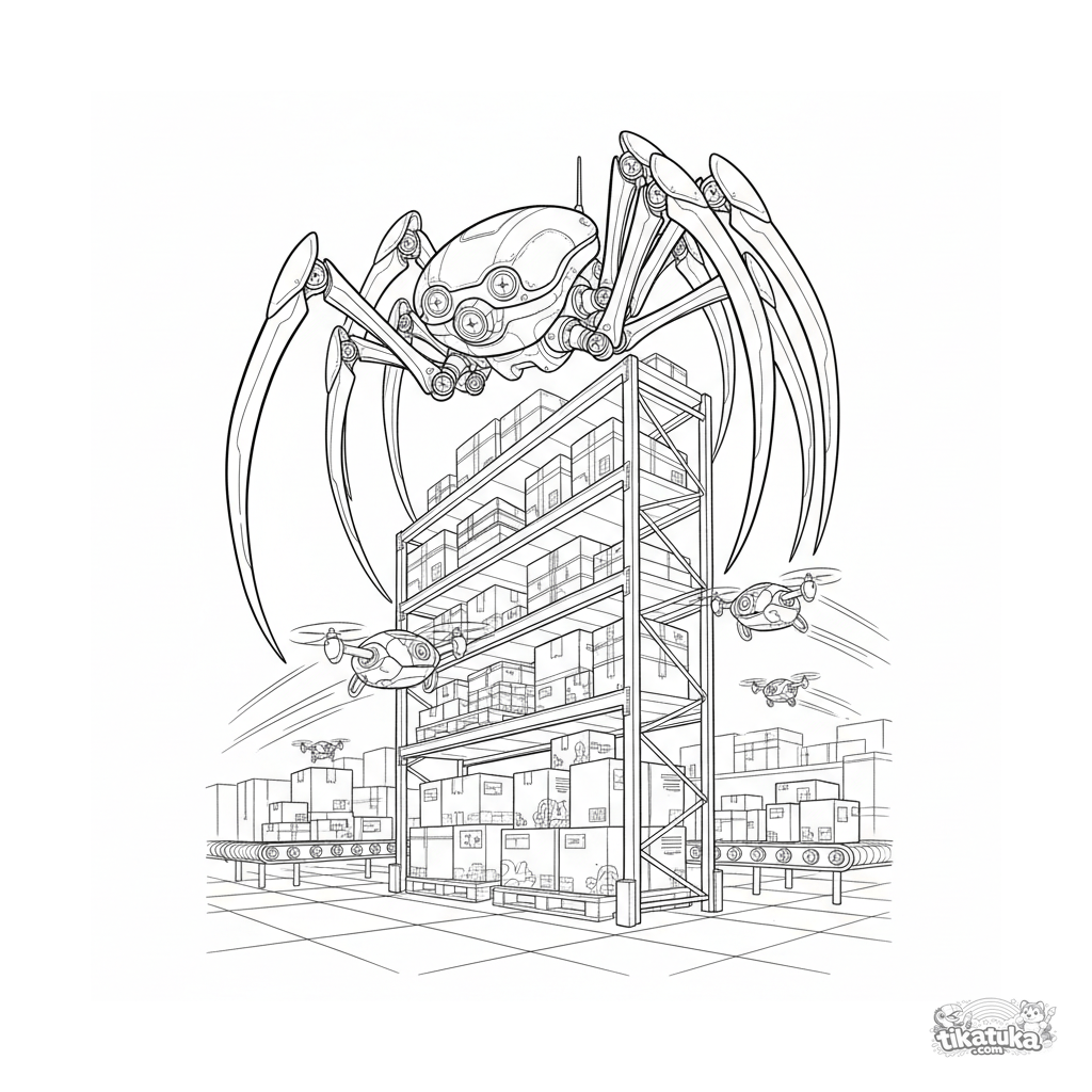 Página para colorear compleja en estilo técnico: un mech-araña en un estante escanea un almacén con drones. Para niños de 10 a 12 años.