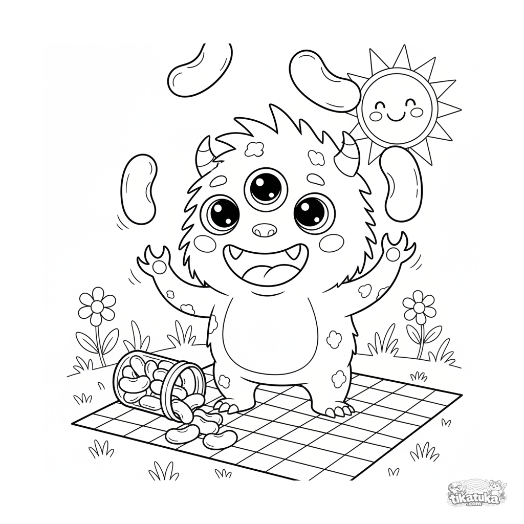 Página para colorear para niños 4-6: un monstruo con pelo de punta malabarizando golosinas en un picnic. Escena dinámica pero simple.