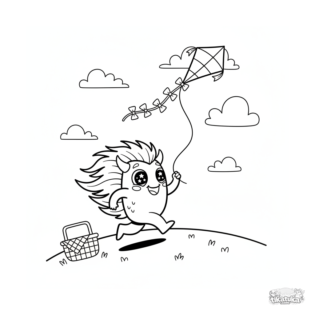 Página para colorear para niños de 4-6 años: un monstruo espinoso corre por una colina volando una cometa a rayas en un picnic. Escena dinámica.